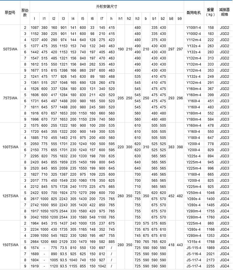TSWA型多級離心泵全系列共5個品種40個規(guī)格,其性能范圍流量Q=1.5~191m3/h,揚程h=17~247m,轉(zhuǎn)速n=1450r/min。